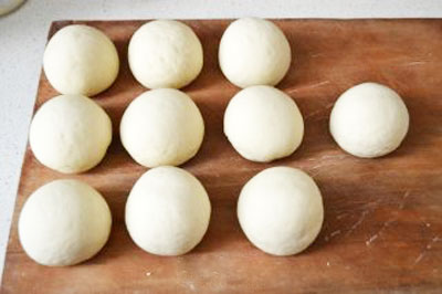 將發(fā)酵好的面團取出放在案板上,揉面進行排氣,揉至原來面團的大小。把面團揉成長條狀,用刀切成等份。將分好的等份面團揉成饅頭形狀。