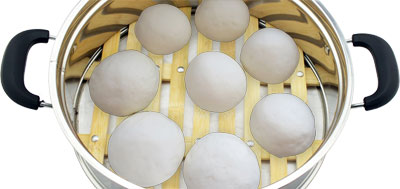 電熱鍋內(nèi)加水,放上蒸籠,將發(fā)酵好的饅頭放蒸籠里,饅頭蒸的時候會變大,所以要留有足夠的空隙,不然饅頭會積壓在一起。蓋上鍋蓋二次醒發(fā)5分鐘。