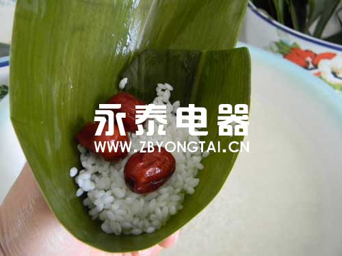 4.拿一片葉子,大頭上彎成碗狀,先放兩粒紅棗,放一把米,再放幾粒紅棗,在放一把米,放兩粒紅棗,填滿。