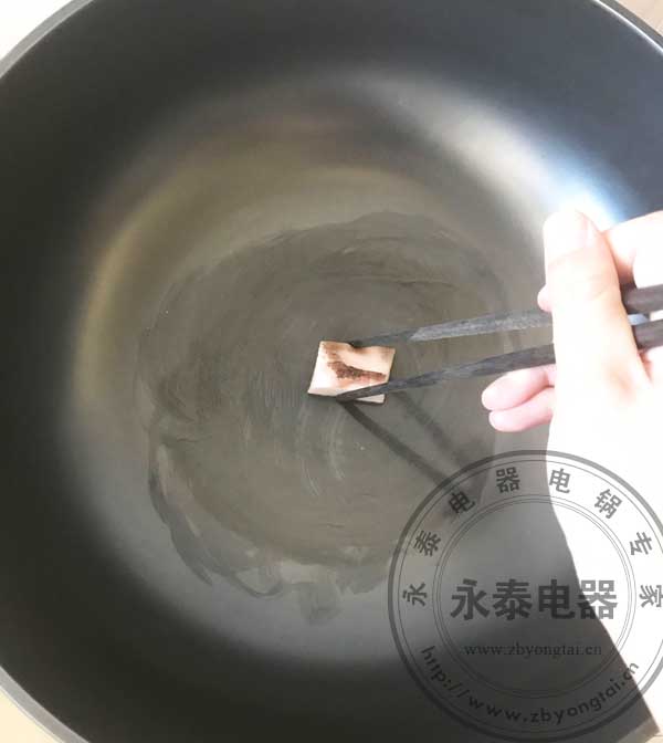 下邊我們開始使用一下,看看好不好用。鐵鍋第一次使用要先開鍋,準(zhǔn)備一塊肥豬肉,用筷子夾住生肥豬肉,以螺旋狀在鍋內(nèi)壁不停地擦拭,油脂均勻地涂滿整個(gè)鍋面。重復(fù)幾次,大概十幾分鐘即可。